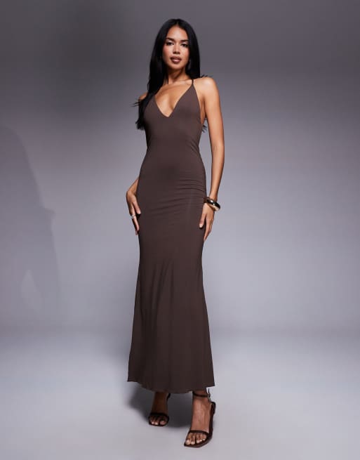 Oh Polly - Robe longue dos nu à décolleté plongeant - Marron chocolat