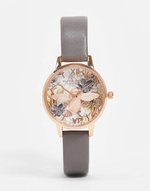 Olivia Burton - Montre en cuir avec cadran à motif abeille en 3D - Gris/or rose