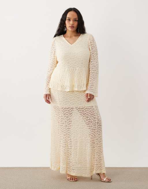 ONLY Curve - Ensemble en dentelle avec blouse et jupe mi-longue - Beige