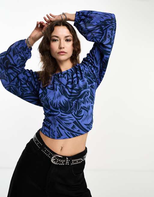 Only - Blouse courte nouée dans le dos à imprimé abstrait - Bleu