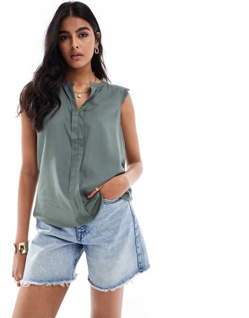 ONLY - Blouse sans manches à col en V et bords en dentelle - Vert