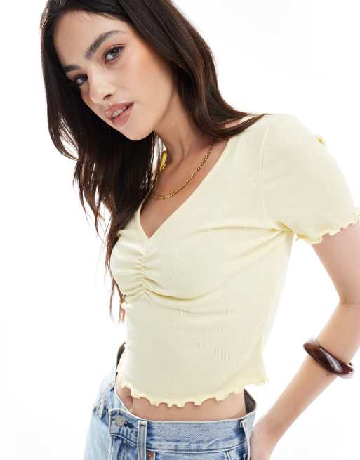 ONLY - Crop top froncé devant à manches courtes - Jaune clair