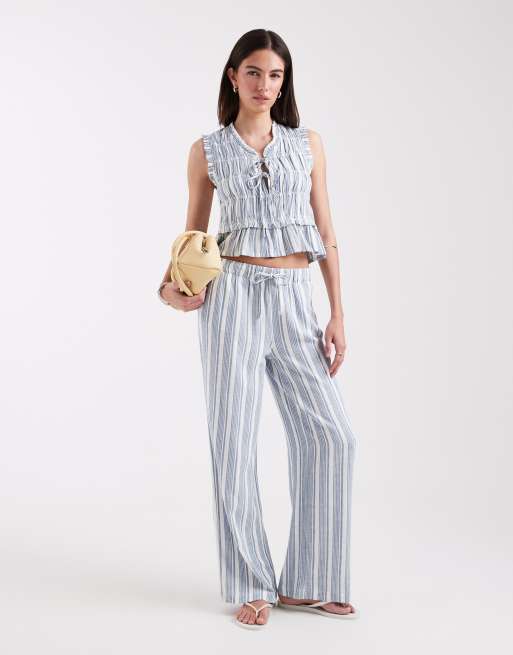 ONLY linen blend tie front ruched top & linen blend pull on trouser co-ord in blue stripes