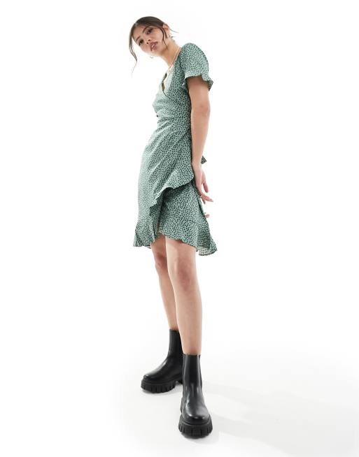 Only - Robe portefeuille courte à volants - Vert à pois
