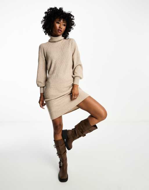 Only - Robe pull mi-longue en maille à manches bouffantes - Beige