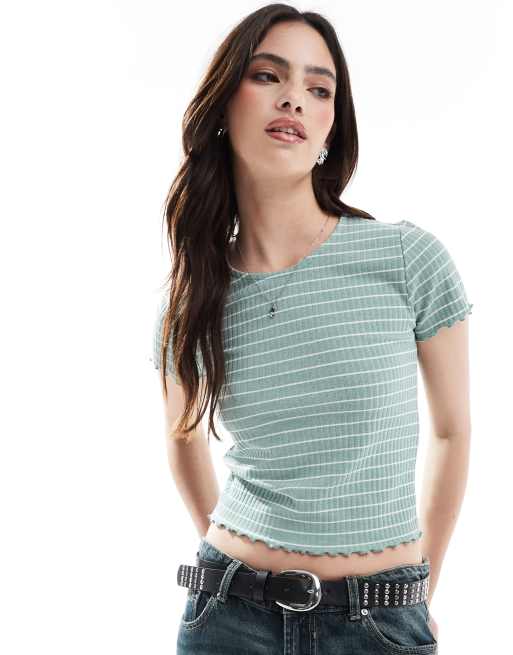 Only - T-shirt crop top à bordure ondulée et rayures - Vert sauge