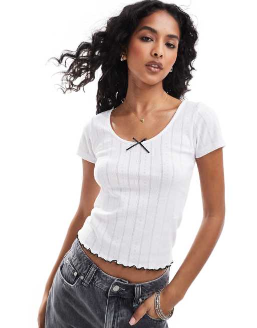 ONLY - Top à manches courtes en maille pointelle avec bordure contrastante - Blanc