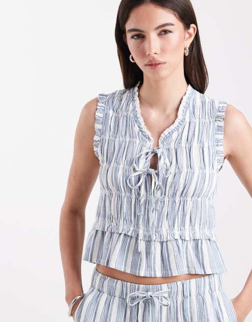 Only - Top d'ensemble froncé en lin mélangé à rayures avec liens devant - Bleu clair