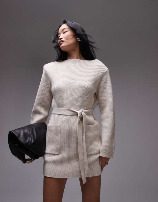 & Other Stories - Robe côtelée courte en coton et laine mélangés avec taille nouée - Crème