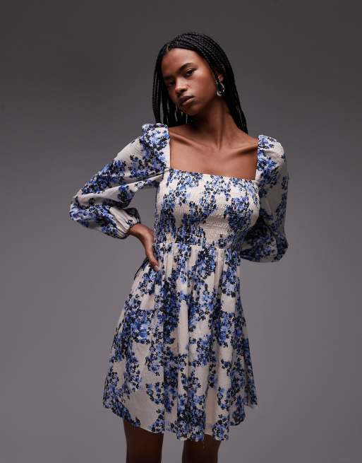 & Other Stories - Robe courte à fleurs avec encolure carrée et corsage froncée - Bleu