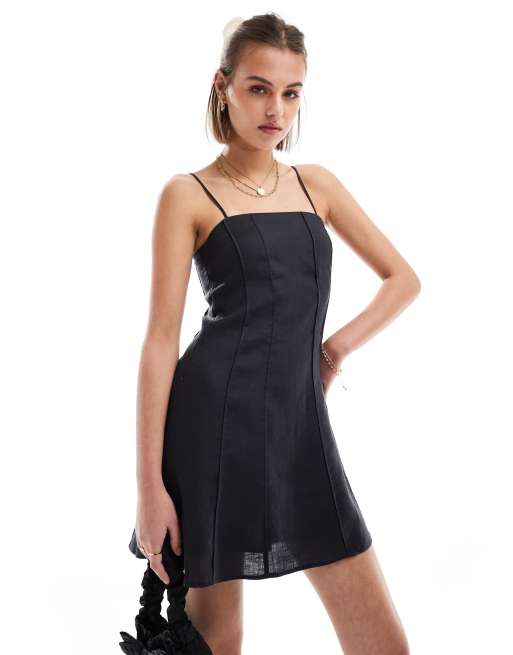 & Other Stories - Robe courte et fluide en lin avec bretelles réglables et empiècements surpiqués - Noir