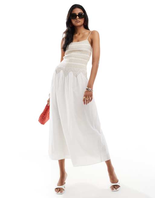 & Other Stories - Robe mi-longue à taille basse et smocks en fil contrastant - Blanc