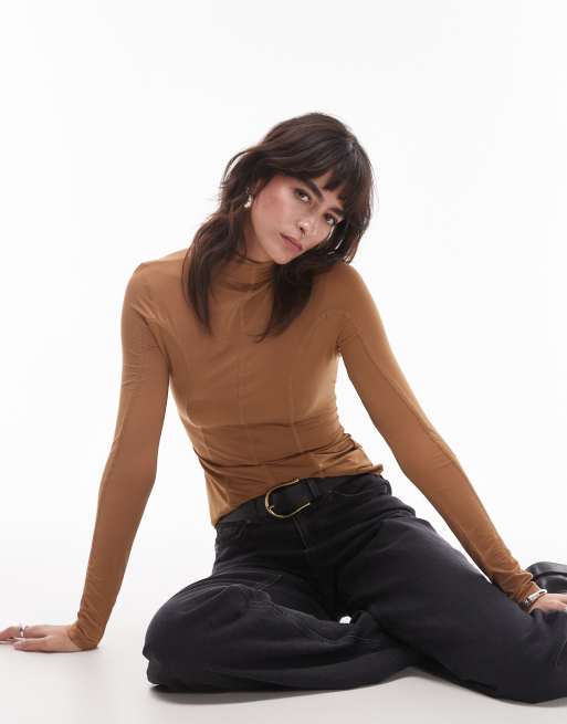 & Other Stories - Top en jersey semi-transparent avec col montant et surpiqûres - Marron clair