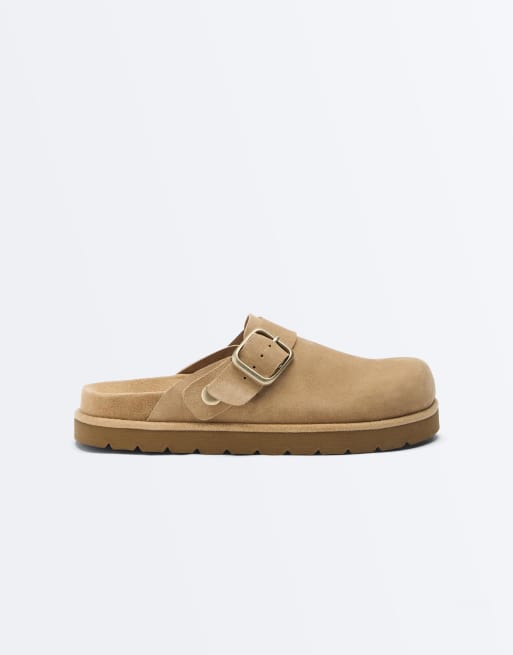 Oysho - Mules en croûte de cuir à boucle - Marron toasté