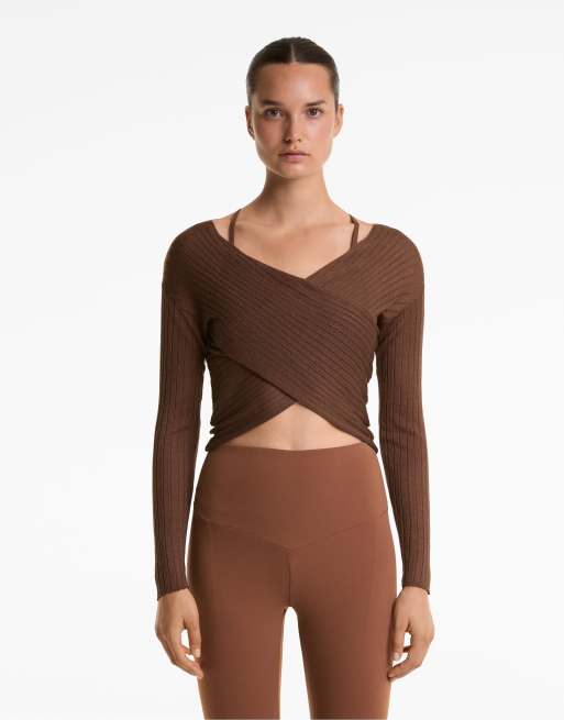 OYSHO - Pull croisé en maille fine côtelée semi-transparente - Marron
