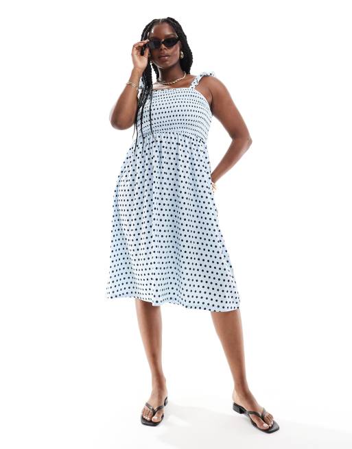Pieces Curve - Robe longue en jersey texturé à pois et bretelles volantées - Bleu