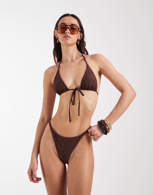 Pieces - Bas de bikini d'ensemble coupe string ajustable - Marron acajou foncé