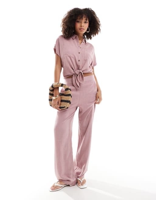 Pieces - Ensemble en lin avec pantalon ample et chemise nouée à l'avant - Rose