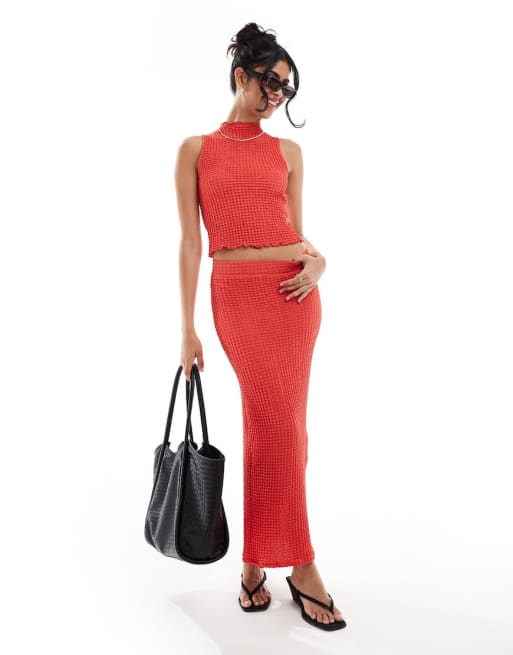 Pieces - Ensemble texturé avec jupe longueur fantaisie et top sans manches - Rouge