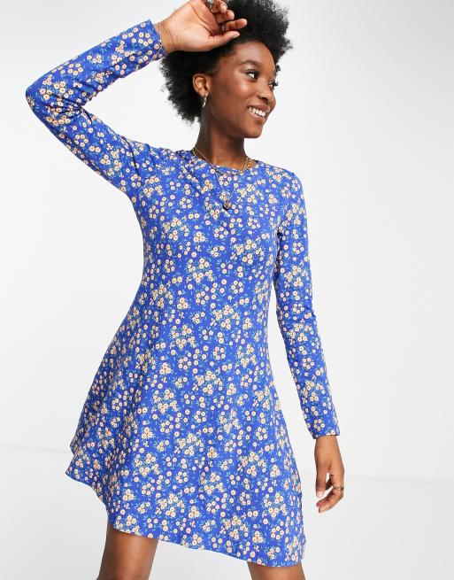 Pieces - Flora - Robe patineuse courte à manches longues à fleurs - Bleu outremer intense