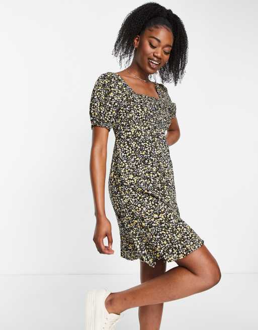 Pieces - Robe courte à fleurs nouée dans le dos - Noir et jaune