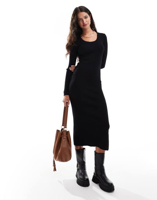 Pieces - Robe longue de qualité supérieure structurée et côtelée à manches longues - Noir