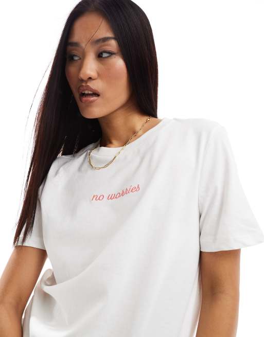 Pieces - T-shirt à imprimé « No Worries » - Blanc