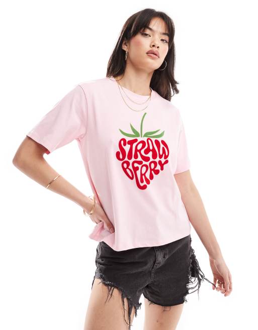 Pieces - T-shirt oversize à imprimé Strawberry en feutre - Rose