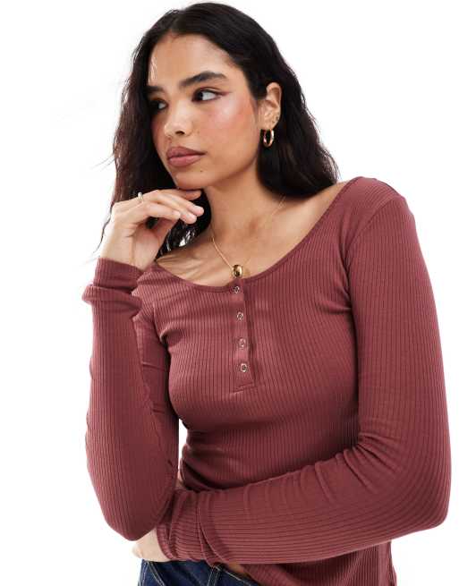 Pieces - Top côtelé à manches longues et boutons-pression - Épice