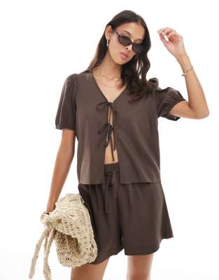 Pieces - Top d'ensemble noué à manches courtes - Marron chocolat