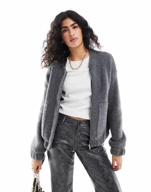 Pieces - Veste en maille duveteuse bouclée - Gris foncé
