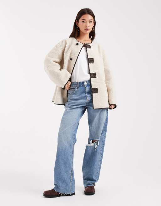 Pieces - Veste réversible en tissu duveteux et imitation cuir - Crème et marron