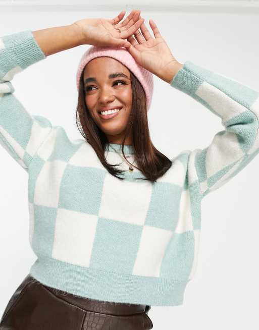 Pimkie - Pull à motif damier - Vert sauge et blanc