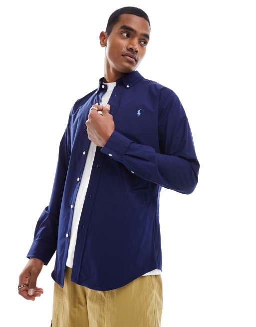 Polo Ralph Lauren - Chemise ajustée en popeline à logo joueur de polo avec col boutonné - bleu marine