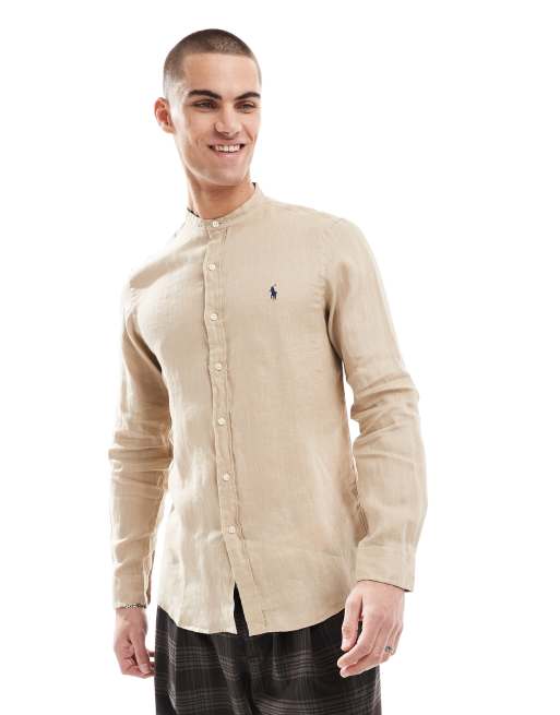 Polo Ralph Lauren - Chemise en lin ajustée col officier à logo emblématique - Beige