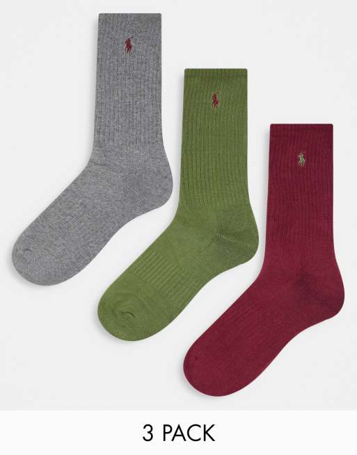 Polo Ralph Lauren - Lot de 3 paires de chaussettes en coton mercerisé avec logo - Bordeaux, gris et vert