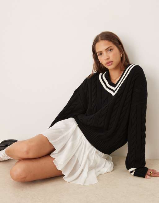 Polo Ralph Lauren - Pull en maille torsadée à col V - Noir et blanc