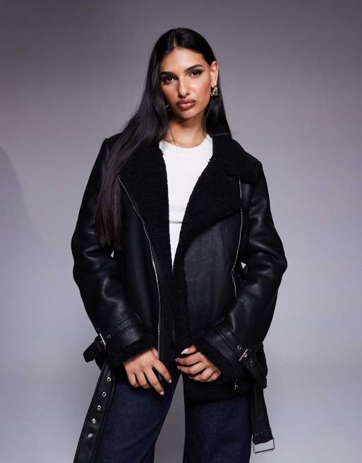 Princess Polly - Blouson aviateur en imitation cuir et imitation peau de mouton avec boucles - Noir