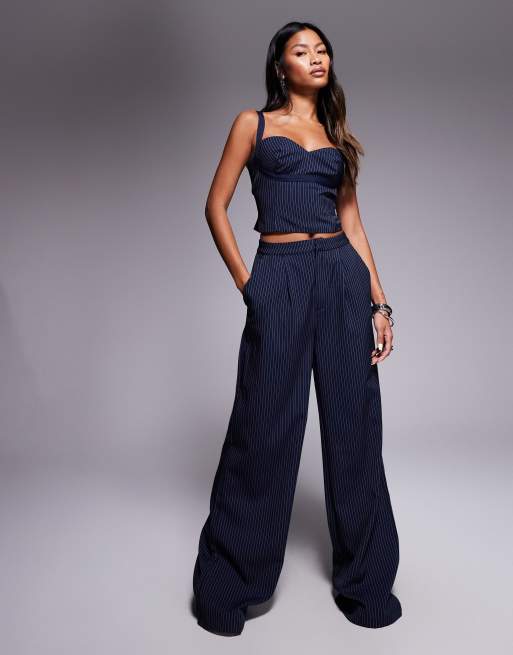 Princess Polly - Briana - Ensemble caraco à décolleté en cœur et pantalon large - Bleu marine à fines rayures