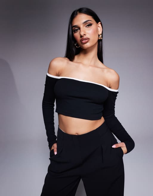 Princess Polly - Crop top à manches longues avec encolure bardot à bord contrastant - Noir et blanc