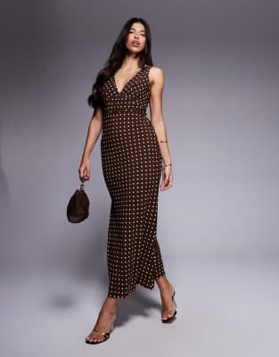 Princess Polly - Nellie - Robe nuisette longue à pois avec col V plongeant et liens noués - Marron