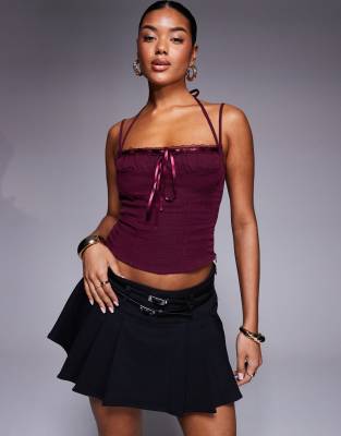 Princess Polly - Top dos nu avec détail en dentelle et buste froncé - Bordeaux