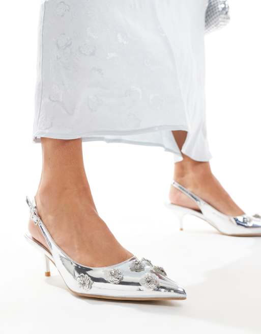 Public Desire - Kyle - Chaussures pointues à petit talon et bride arrière avec ornements fleuris en relief - Argenté