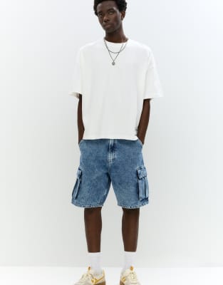 Pull&Bear - Bermuda cargo en jean - Bleu moyen