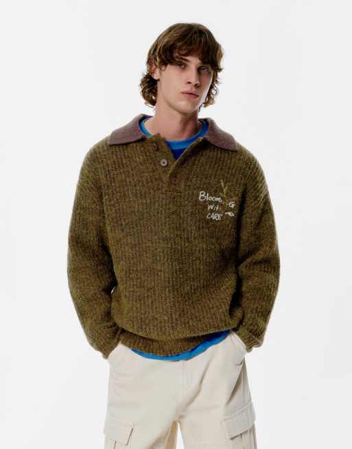 Pull&Bear - Polo à manches longues et détail brodé - Marron