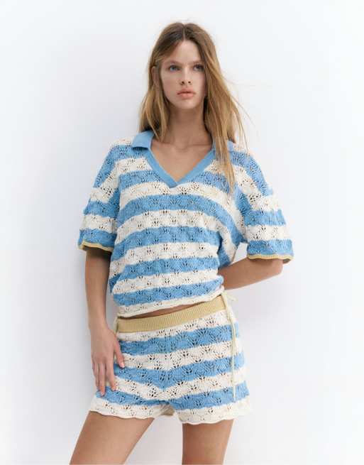 Pull&Bear - Polo au crochet à rayures - Bleu pâle