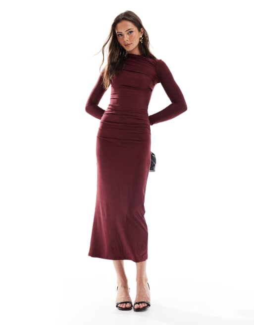 Pull&Bear - Robe longue sculptante en polyamide avec détails froncés - Bordeaux