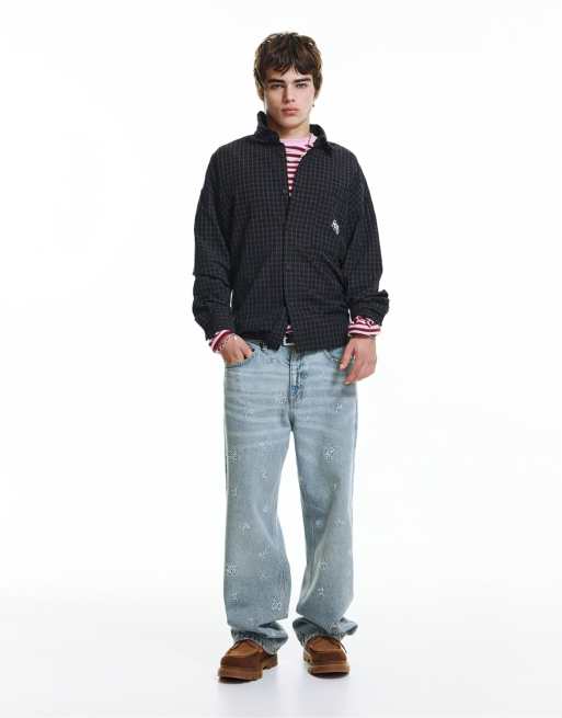 Pull&Bear - STWD - Jean baggy à broderie - Indigo pâle