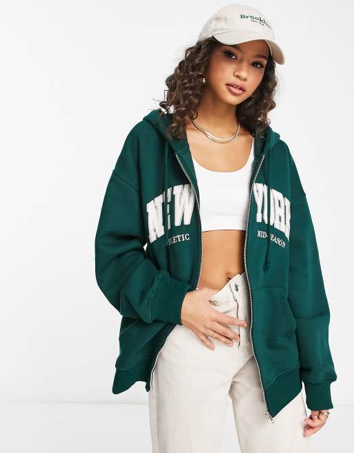 Pull&Bear - Sweat à capuche d'ensemble oversize zippé sur le devant avec inscription New York - Vert