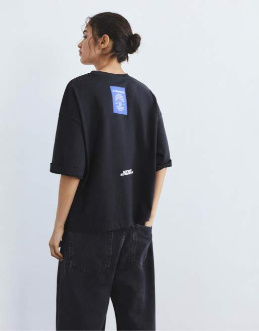 Pull&Bear - T-shirt avec étiquette brodée et slogan - Bleu marine